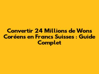 Convertir 24 millions de wons coréens en francs suisses peut sembler complexe, mais avec les bonnes informations et les bonnes pratiques, vous pouvez optimiser cette opération. En comprenant le taux de change, en comparant les différentes méthodes de conversion et en suivant nos conseils, vous pourrez obtenir le meilleur résultat possible. N'oubliez pas de rester informé et de prendre des décisions éclairées. Bonne conversion !