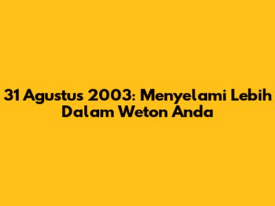 Weton 31 Agustus 2003 adalah Minggu Kliwon dengan neptu 13. Mereka yang lahir pada weton ini konon memiliki karakter yang tenang, bijaksana, dan memiliki jiwa kepemimpinan. Tentu saja, ini hanya gambaran umum, dan setiap individu tetap unik. Weton bisa menjadi alat bantu yang menarik untuk lebih mengenal diri sendiri dan orang lain. Mari kita lestarikan tradisi ini dan terus belajar tentang budaya Jawa.